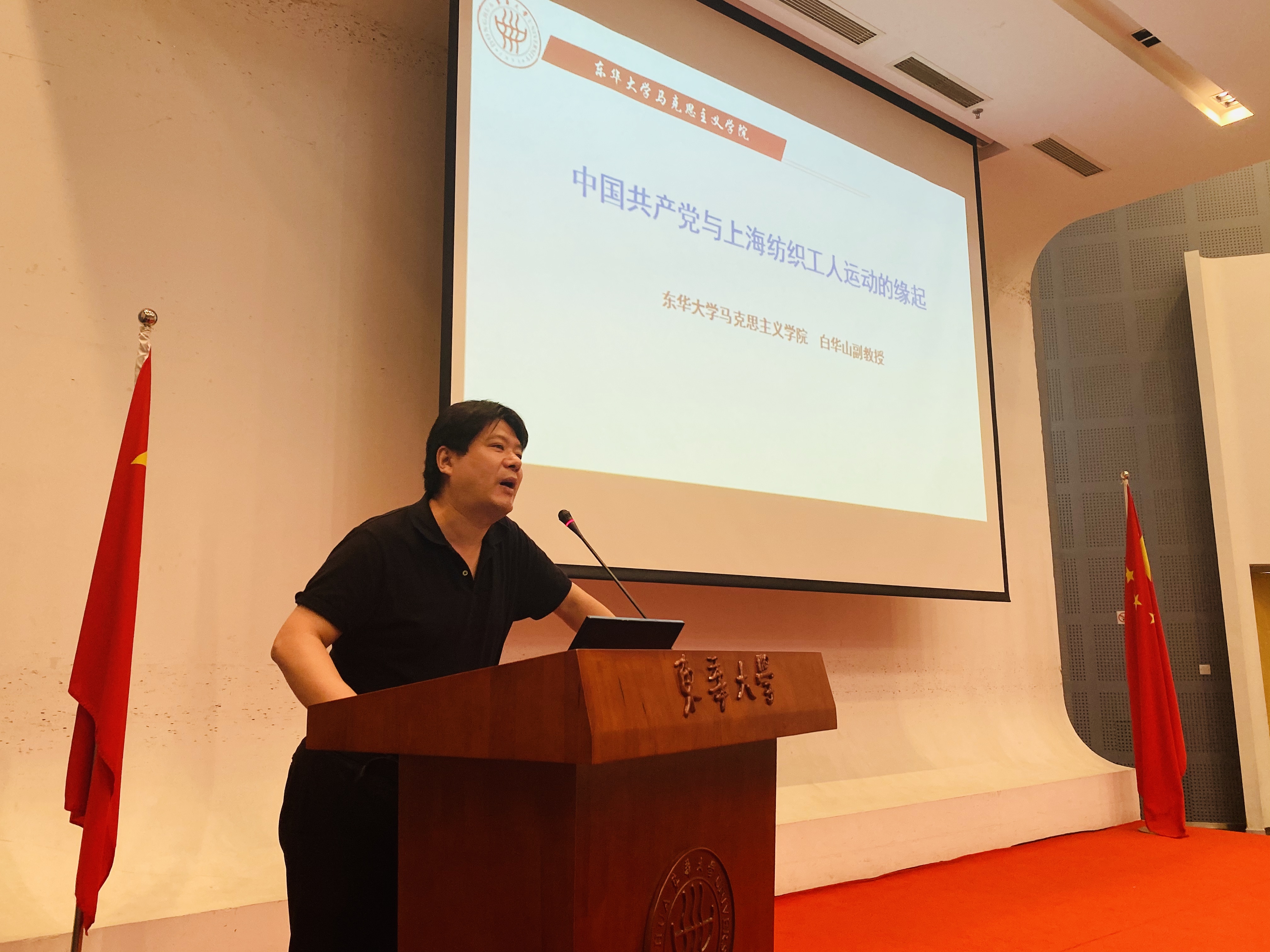 最后,马克思主义学院白华山老师为大家带来“四史”党课——《中国共产党与上海纺织工人运动的缘起》。白老师聚焦中国共产党与上海最早的纺织工人运动的关系,深度挖掘这些资源所蕴含的历史价值和意义,语言生动活泼,让学院党员对党史以及共产党人的精神密码有了更加深入的了解。