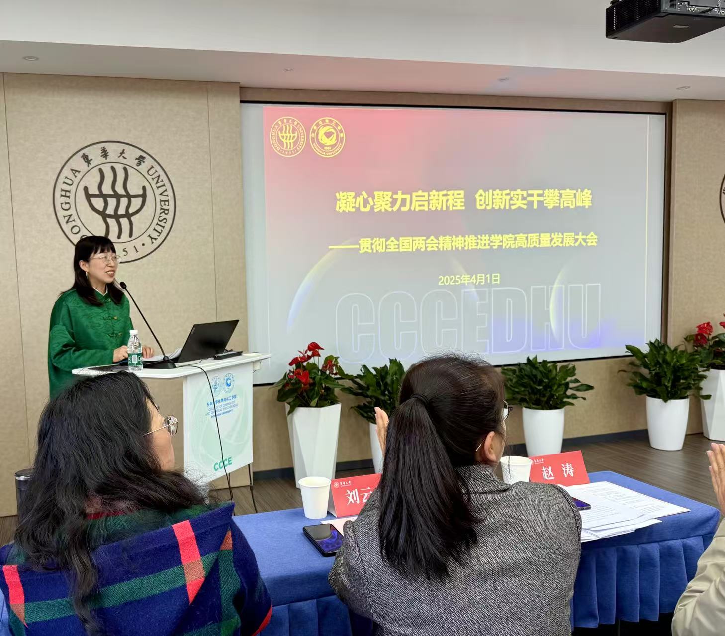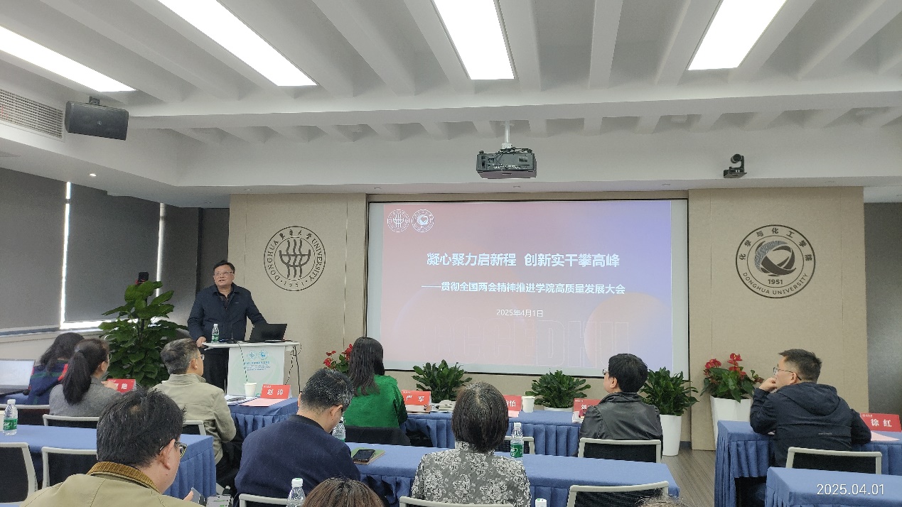 严军书记以《凝心聚力谋发展 团结奋进创一流——以全国两会精神为引领共绘化工学院高质量发展同心圆》为题作主题发言。她提出,学院将坚持“教学创特色,科研筑高地,人才蓄势能”的发展理念,围绕学校三大学科集群布局各方面工作。她强调,实干精神是学院发展的“魂”,要让“敢啃硬骨头”成为全院共识。